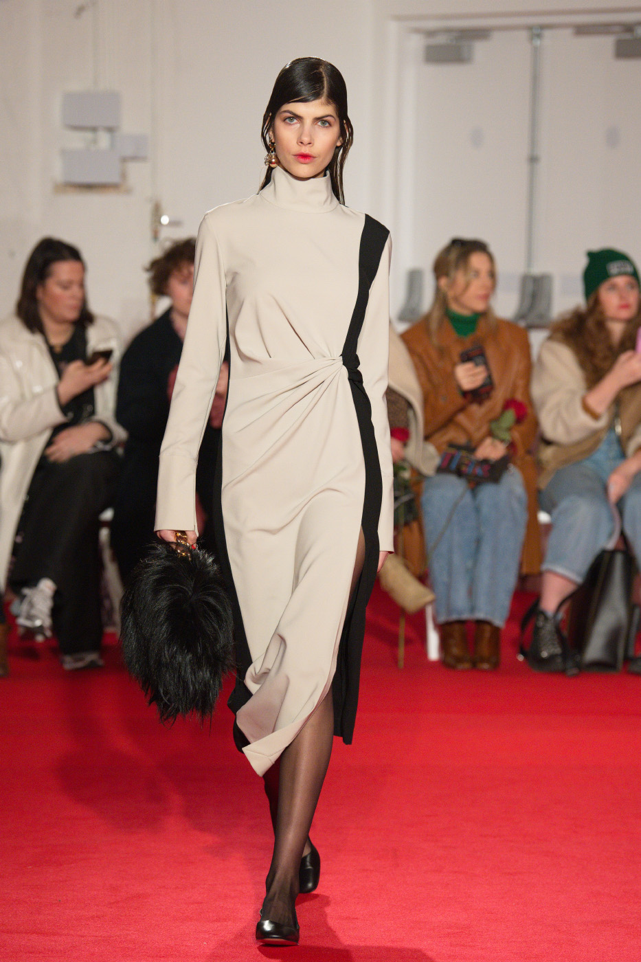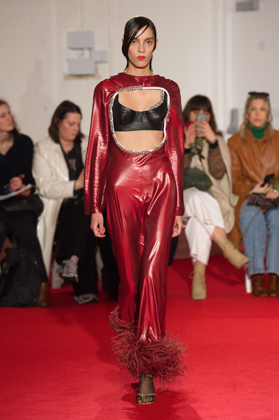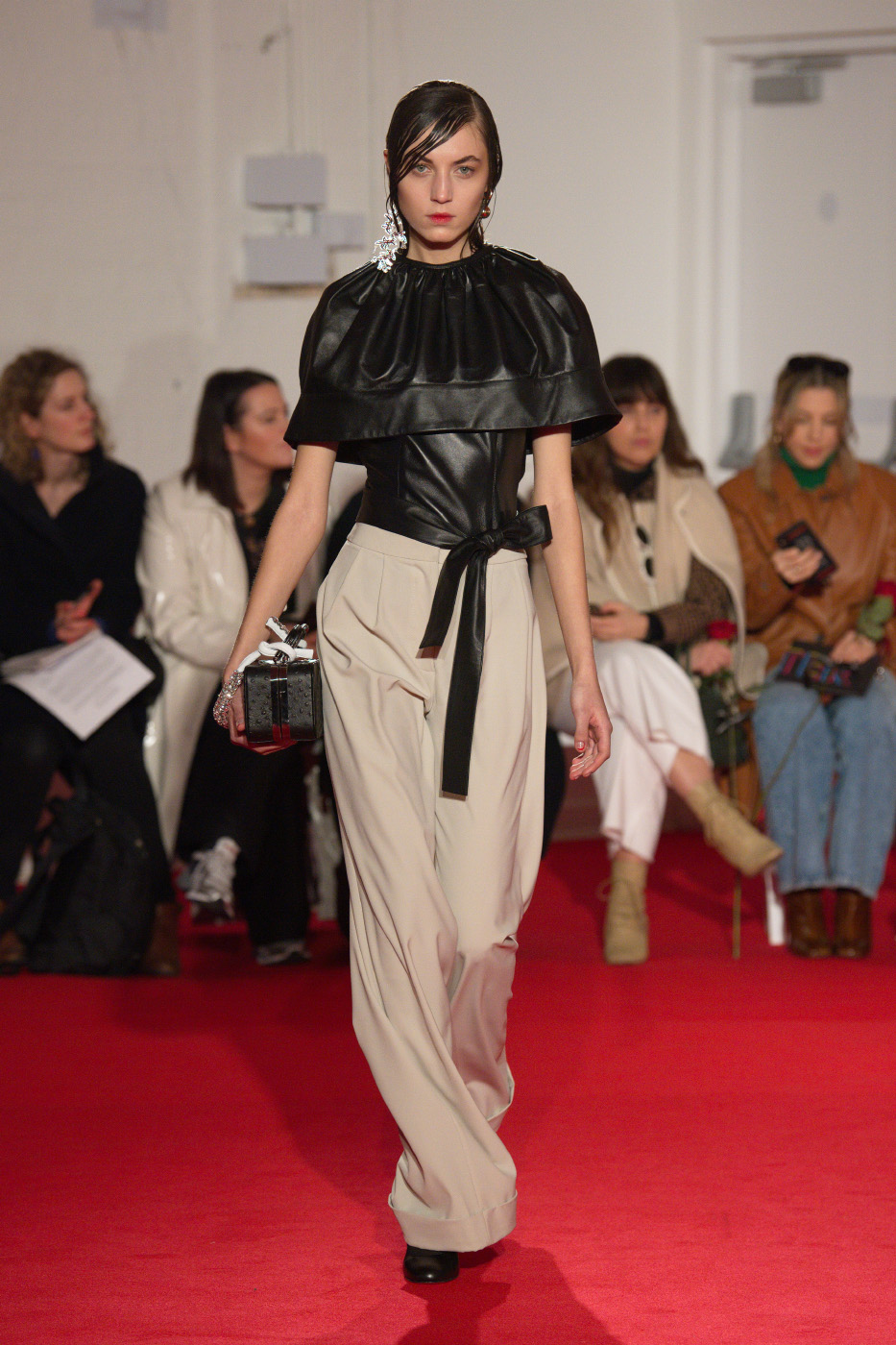Bags appear on the runway for the first time; tiny, disproportionate shapes fasten around the waist and hang loose across the body. Mini bags are attached together to from one, whilst elsewhere styles are shrouded in 16Arlington’s signature feather trim.