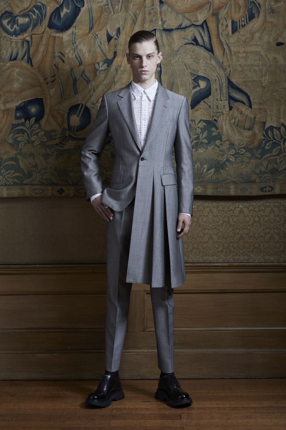 This collection is a dialogue between Alexander McQueen womenswear and menswear. It also references and reminisces on 90's McQueen and the frequent inspiration trips made by the team to Japan at that time. With a traditional tailoring is reconstructed, cut up and pieced together. Referencing the Fall Winter 2019 Alexander McQueen womenswear collection, asymmetric trompe l’oeil suiting comes in men’s pinstripe fabrics, made in the textile mills in the North of England. Double-layered jackets are panelled in different scales of pinstripe, double-dyed black wool gabardine and grey tonic mohair – an early 90's McQueen signature - and feature pleated half skirts. Suiting is worn with striped or white cotton shirting.