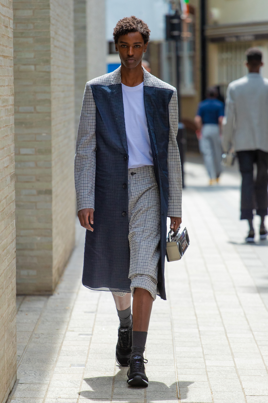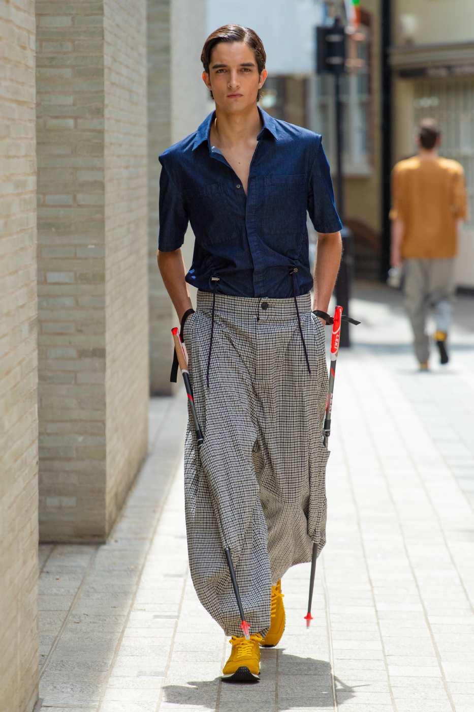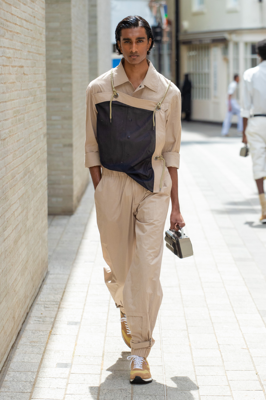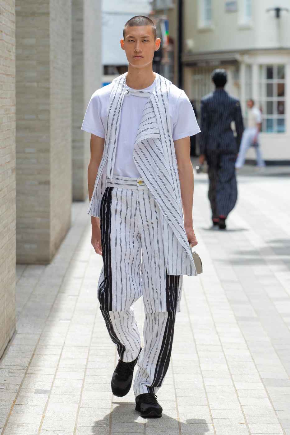 While the collection is imbued with the above themes, the shapes and surfaces of the Chalayan wardrobe remains wearable and practical.The sartorial wool tailoring punctuated by graphic rope compositions stemming from exercises in physical discipline come in navy subtle stripes and grey and black checks. Classic cotton stripes are mixed in crisp shirting with inserted panelling. Multicoloured stripes in jerseys have a celebratory summer feel, visible at times hidden under layers. Summer cotton tailoring comes in 3 different stripes with a charming woven texture. The House Chalayan blue and white stripe 'happiness code' comes in cotton weave specially developed in Japan, seen this time as outerwear and separates.
