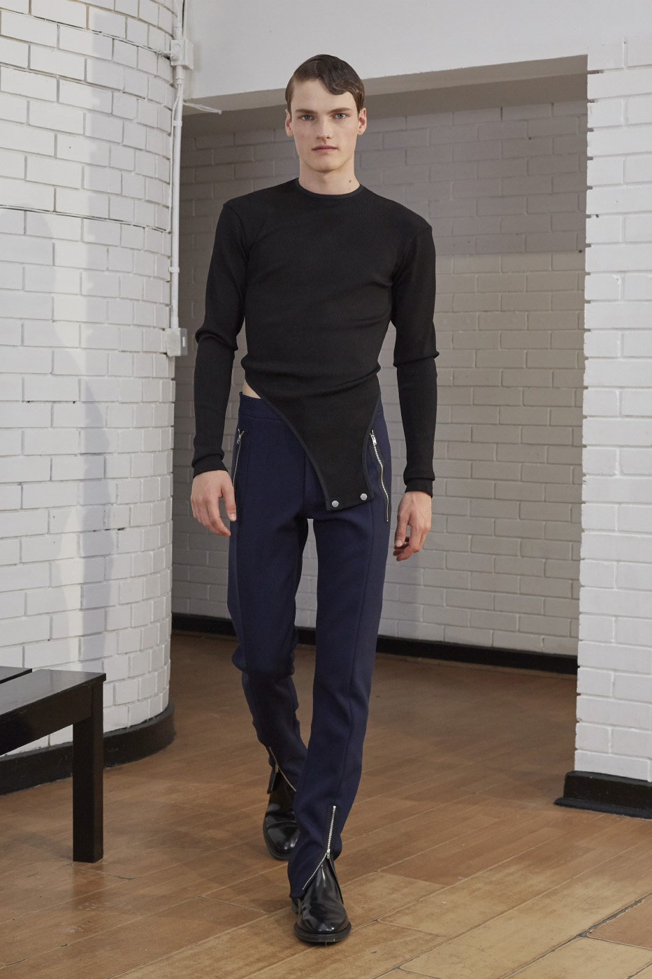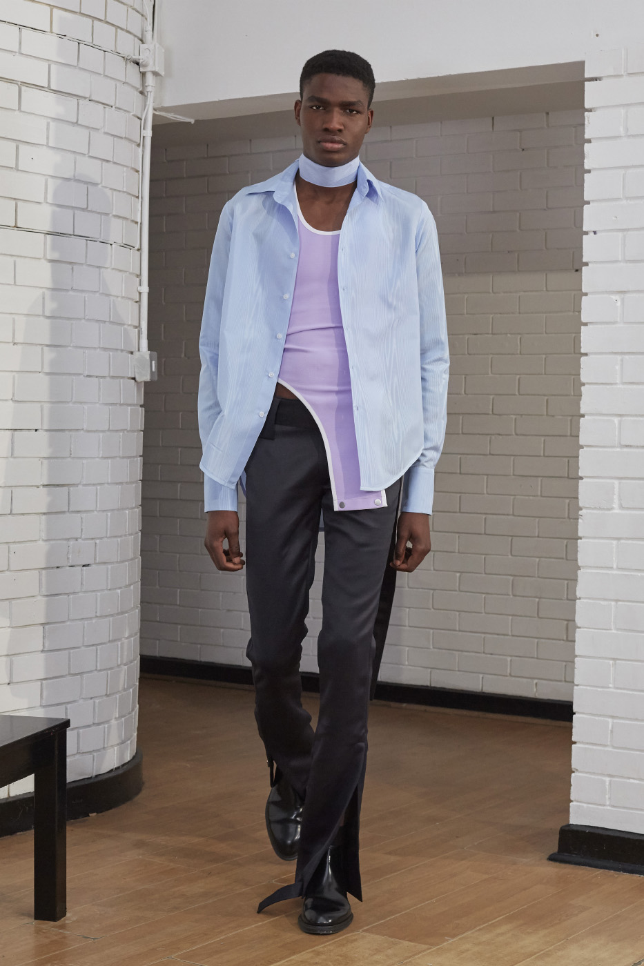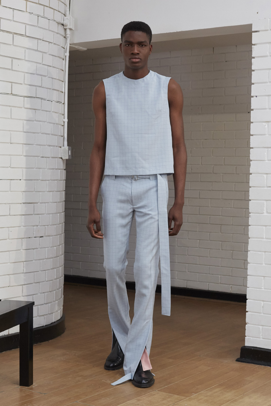 Now with several seasons to look back on, Fletcher found creativity within his own archive. Understanding the pieces that have previously shaped collections and developed into signatures, you’ll find these here once again, but paraphrased to meet the optimism recently spending time in America offered to this Central Saint Martins graduate. The familiar navy, blue and monochrome color palette is awkwardly interjected with hopeful powder blues and lilacs that, while coming from a similar origin, don’t quite perfectly sit together.