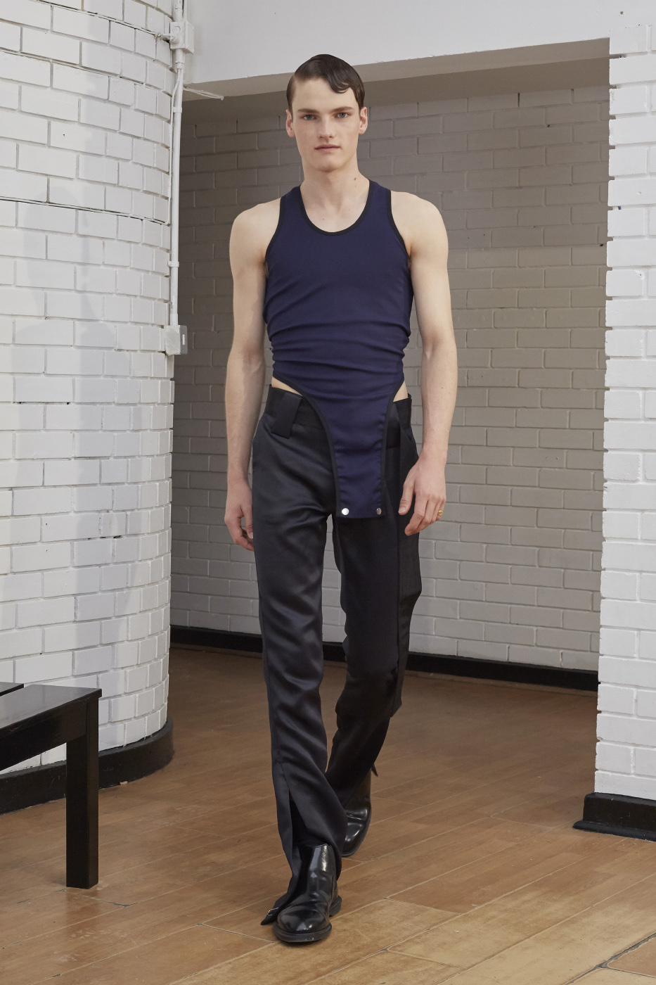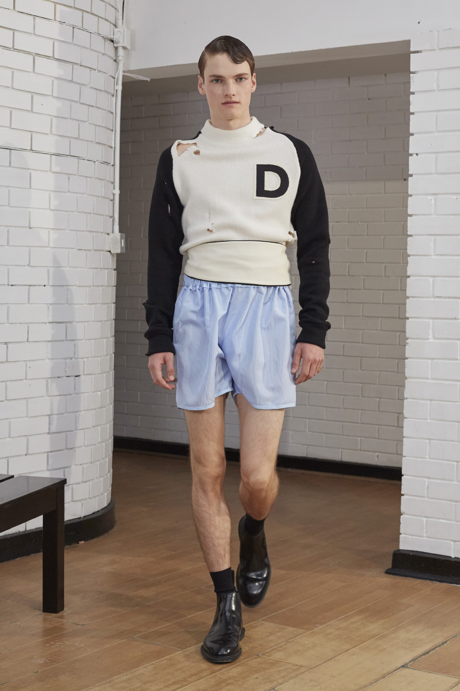 If in the past there’s been longing and looking to Fletcher’s British heritage, this time the muddied pitches of the North have been exchanged for the preppy football fields of an idyllic – albeit slightly twisted - America. It’s prom night and the Daniel W. Fletcher muse is fresh from the big game. His date is waiting and he’s not entirely sure what he’s going to piece together. Is it the time to wear the gym shorts with his long-loved sweater and a necktie for a nod to formality, or the lilac wrestling leotard stolen from the Lost and Found, repurposed as a backdrop to a blue button-down shirt? Perhaps. But there lies his father’s oversized tailoring. The seams are raw and the split trouser seams will flow over his polished-up shoes.