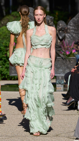 Salinas’s motifs of roses, fish scales, feathers and shells traced curves and draped shoulders. While earlier collections leaned on statement knitwear, SS26 broadened silhouettes to account for market appeal. Dresses and layered separates were featured alongside flared trousers, jackets and mini skirts. From soft ruffles to sculpted shoulders, J. Salinas brought a lot more variety. Soft tones of pastels including dragée pink, sage green, sky blue were contrasted with notes of tangerine and turquoise. The hand-knit construction and level of detail, a truly spectacular feat.