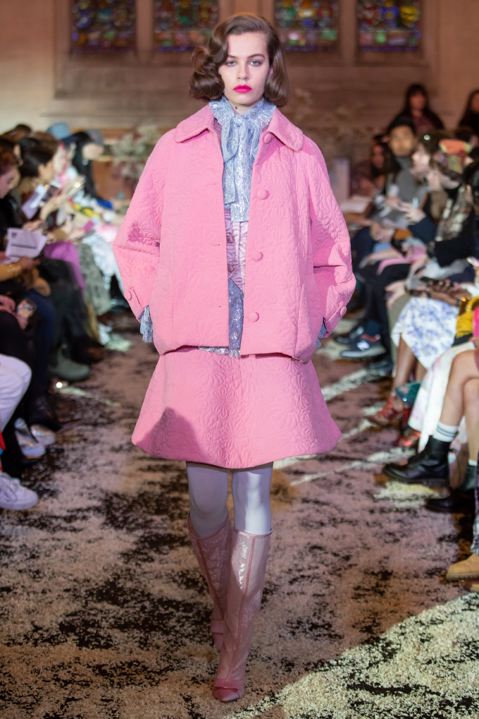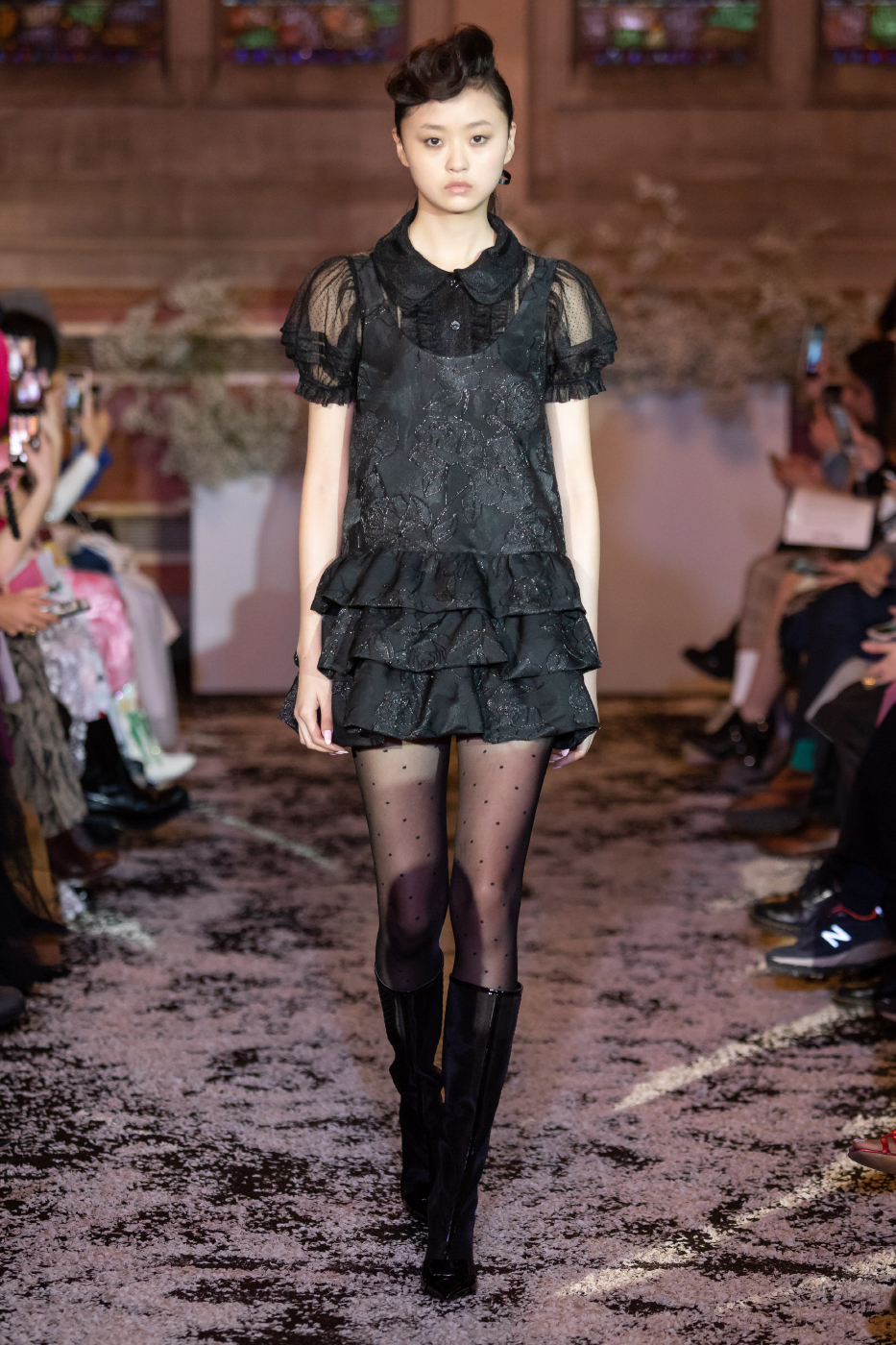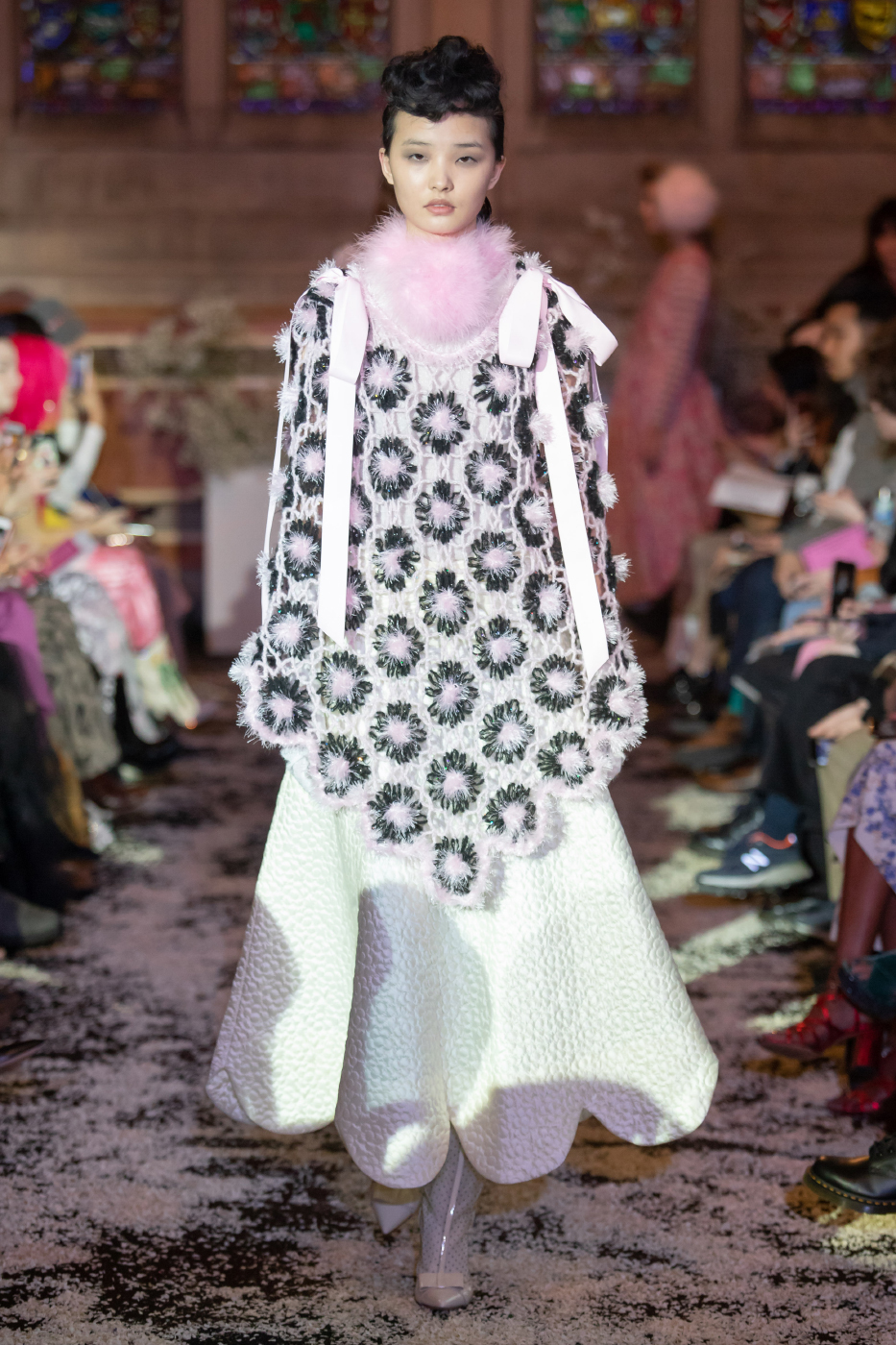 Ryan LO explored the roots of kawaii by looking at the Japanese illustrator Rune Naito, whose 1960s illustrations of doe-eyed girls with their bouffant hair and retro frocks. By day, she’s cosy in double-faced quilted nylon coats and jackets with matching skirts. By afternoon tea, she’s in drop-waist lace dresses. By night, only a cocktail dress with a voluminous tiered skirt will do. He summons the cannon of prettiness and festoons everything with aplomb; corsages, pussy bows, feathers and frills. Matchy-matchy. Tone-on-tone. Not a Ginger Rogers step out of place.