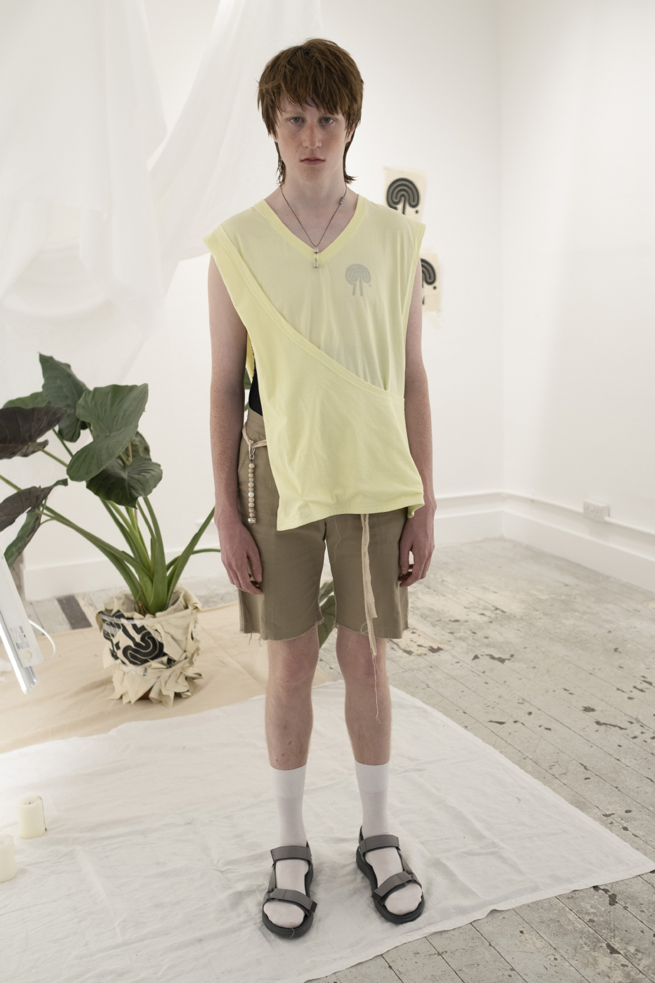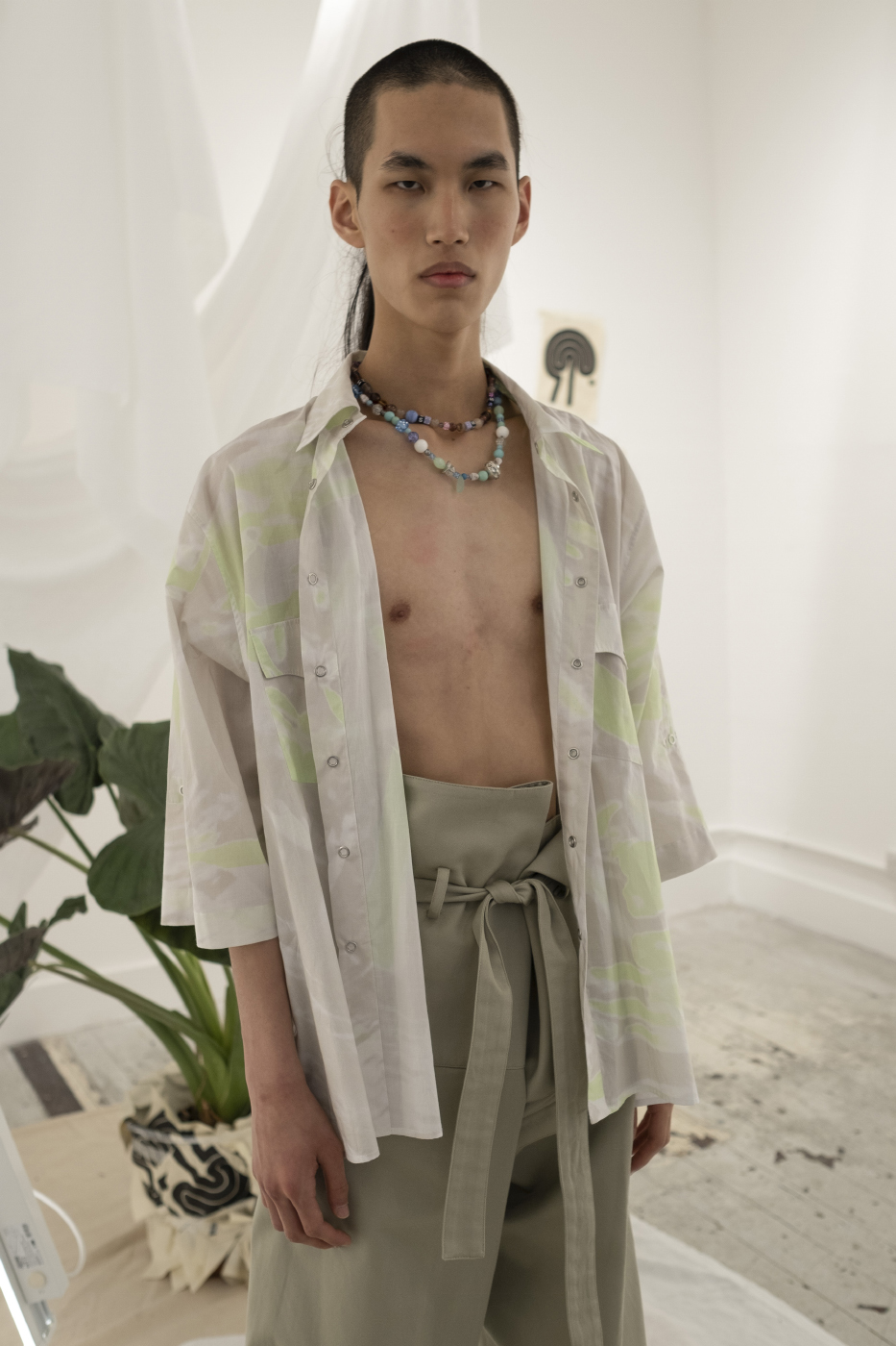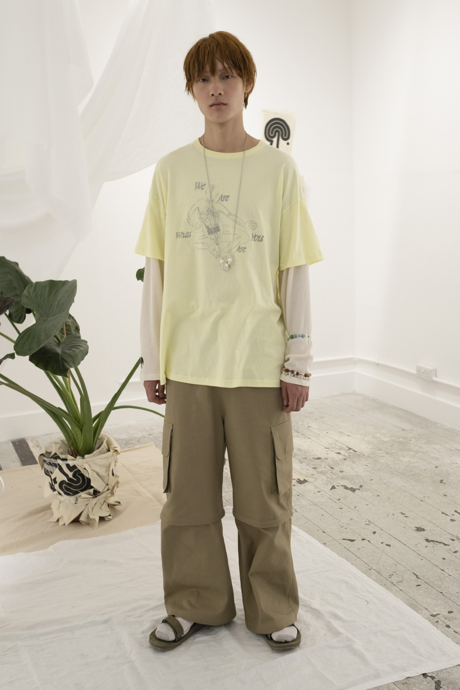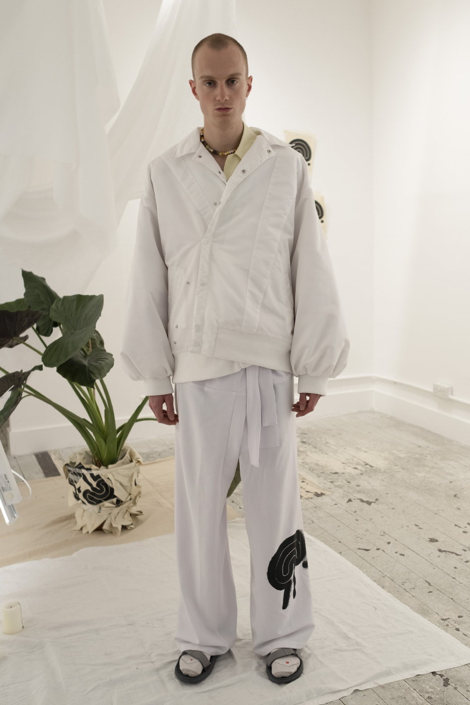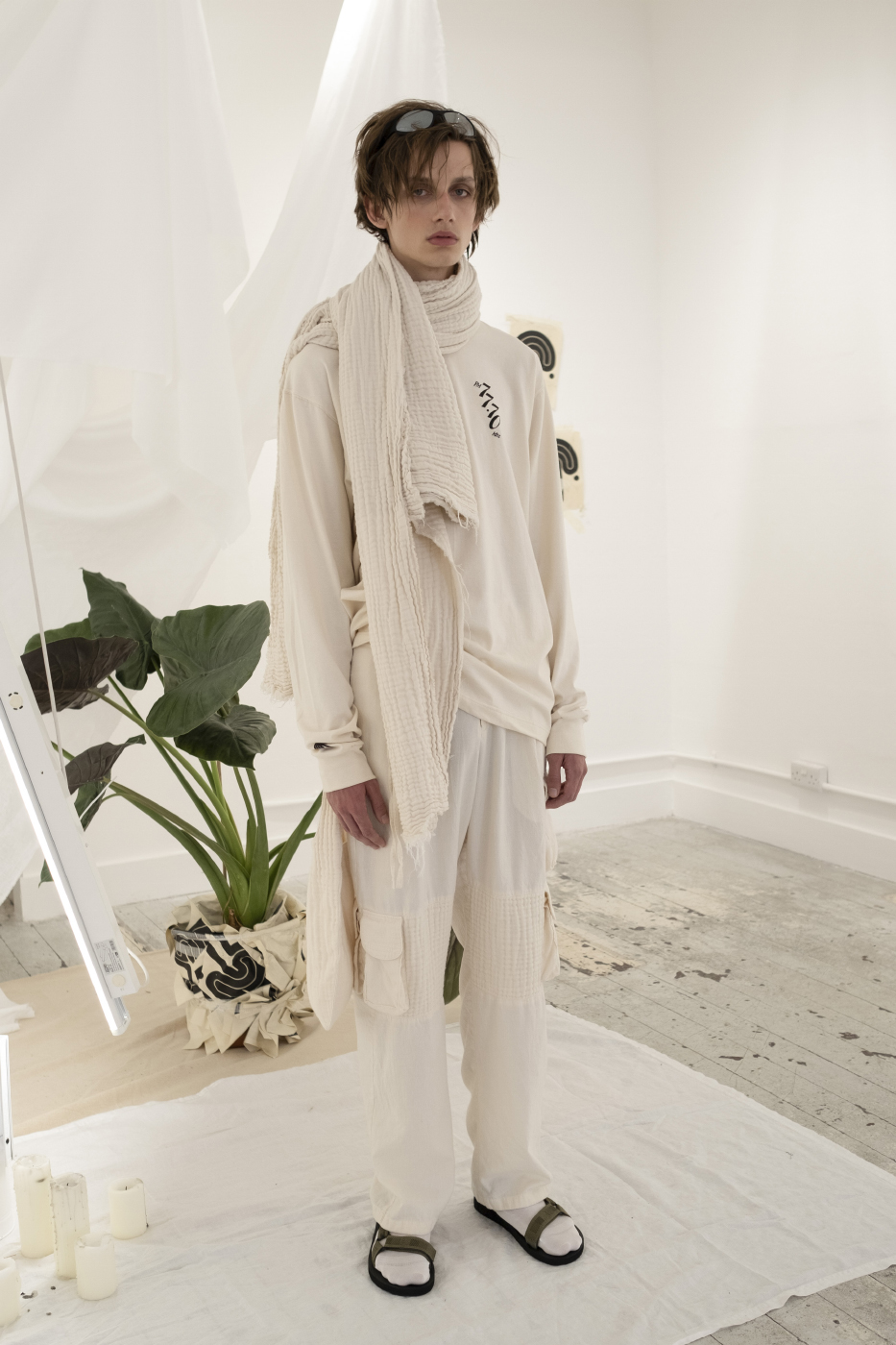 Montreal born designer, Jean-Loup LeBlanc Roy envisions an uniform for this community by refining and reinterpreting American shapes and juxtaposing rigidity and fluidity in the search for harmony. The Collection features distorted lines and patterns, acid washed and overdyed fabrics, all translating a 'psychological' trip onto each garment. In this context, comfort becomes primordial: Oversized garments are wrapped around the body, hugging the human form. Utilitarian details inspire the wearer to achieve a self-sustained attitude, whilst the soft colour palettes of white, green, yellow and brown stimulate inner purity.