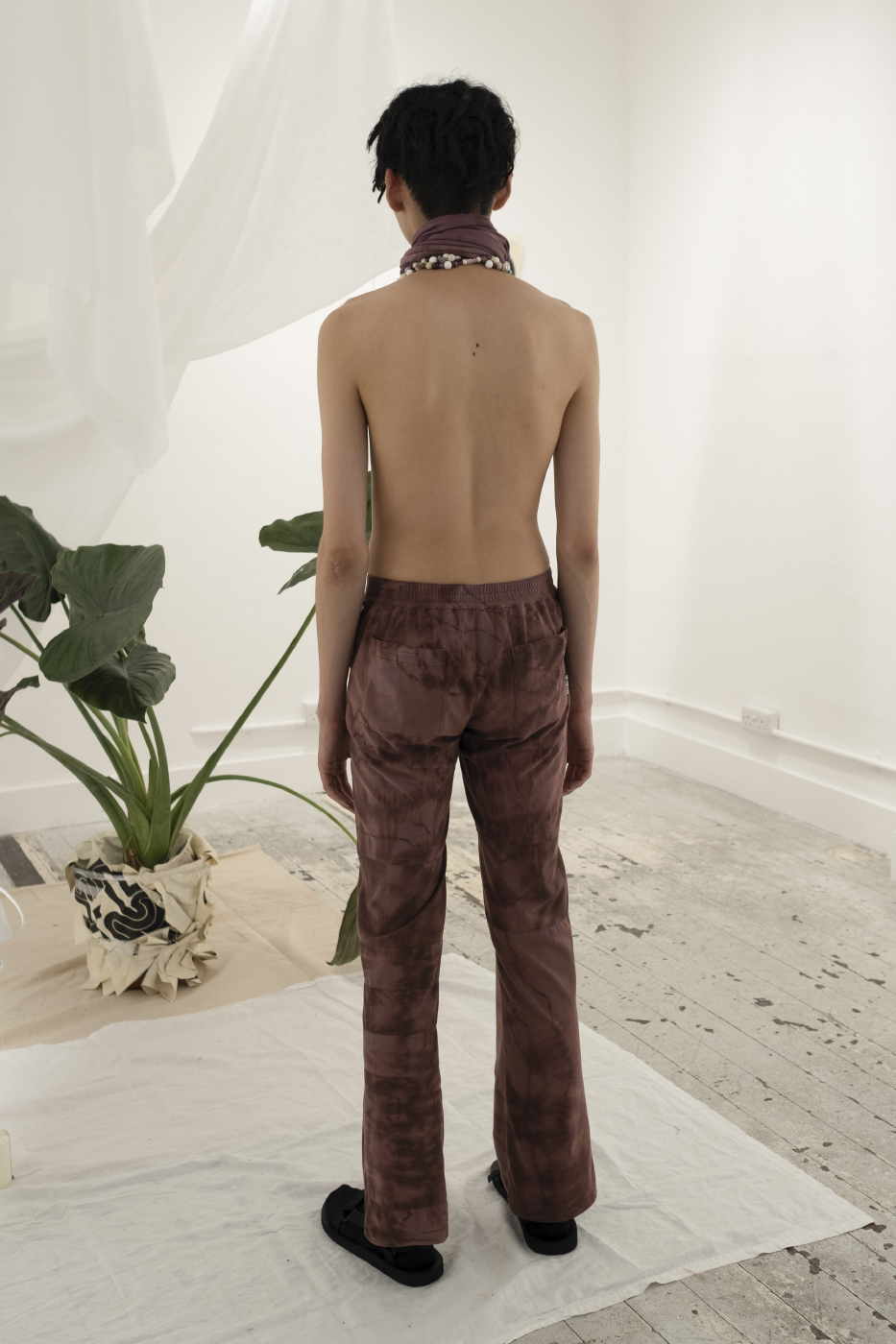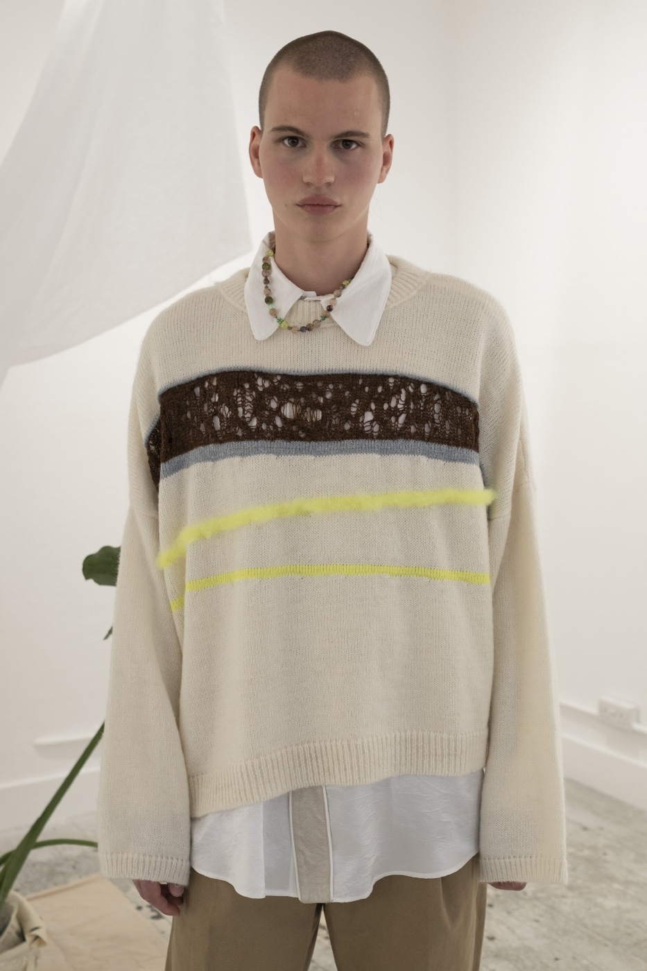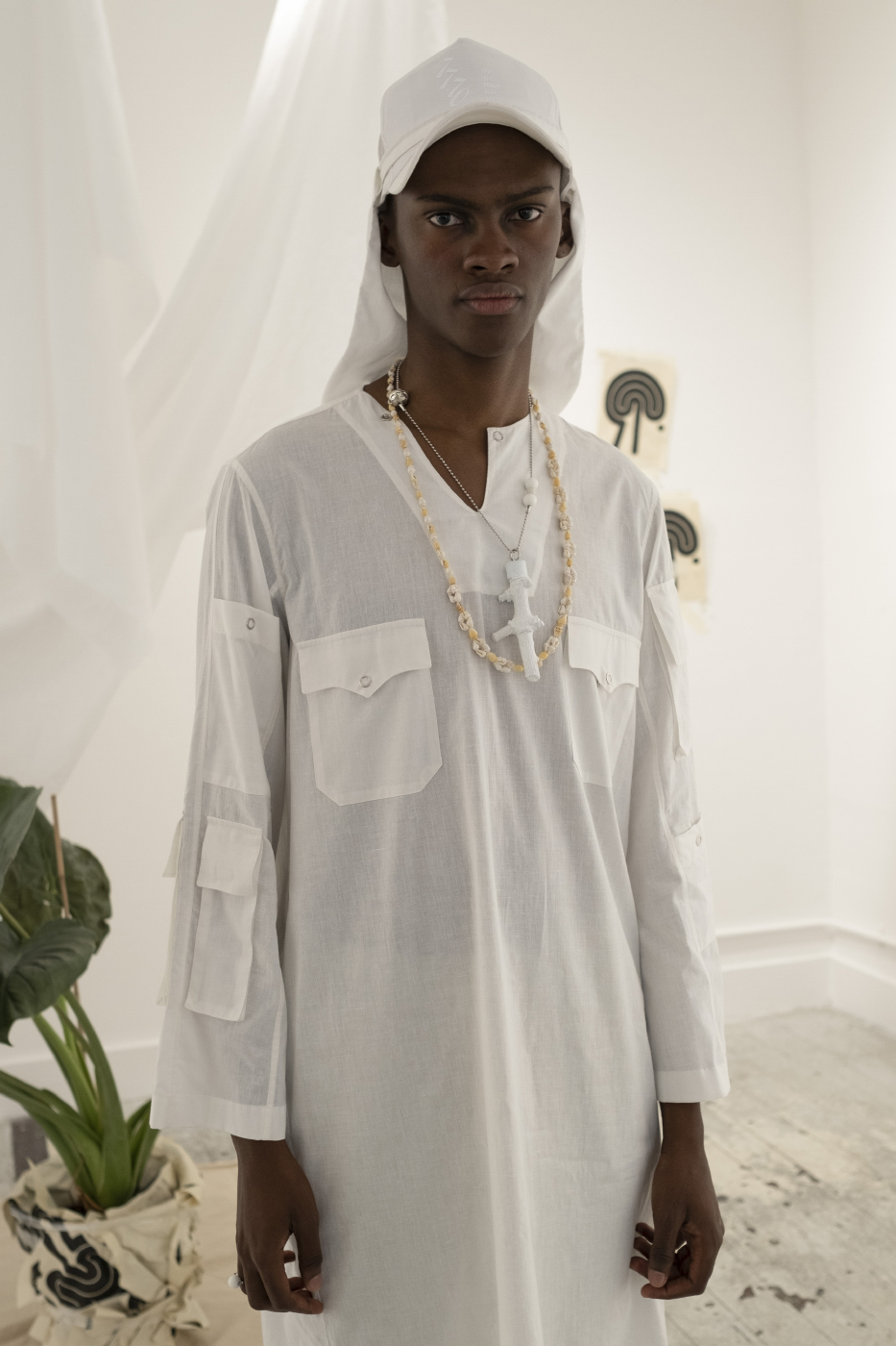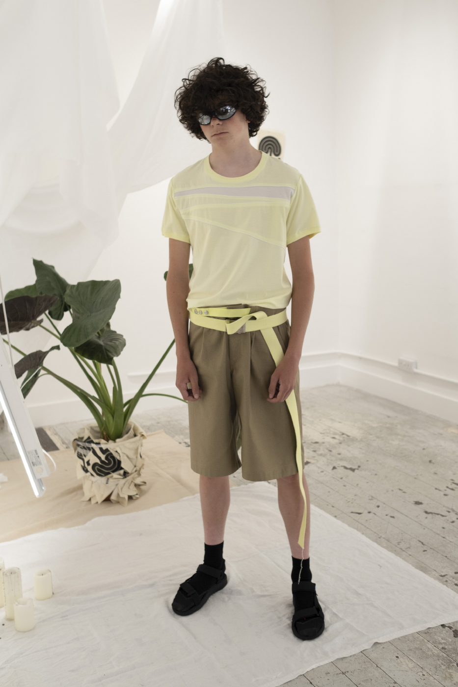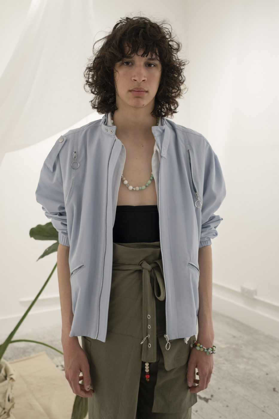 Montreal born designer, Jean-Loup LeBlanc Roy envisions an uniform for this community by refining and reinterpreting American shapes and juxtaposing rigidity and fluidity in the search for harmony. The Collection features distorted lines and patterns, acid washed and overdyed fabrics, all translating a 'psychological' trip onto each garment. In this context, comfort becomes primordial: Oversized garments are wrapped around the body, hugging the human form. Utilitarian details inspire the wearer to achieve a self-sustained attitude, whilst the soft colour palettes of white, green, yellow and brown stimulate inner purity.